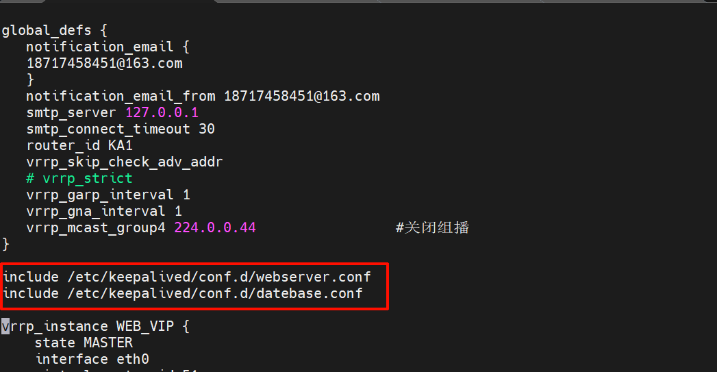 主配置文件 /etc/keepalived/keepalived.conf 引入两个业务配置文件: