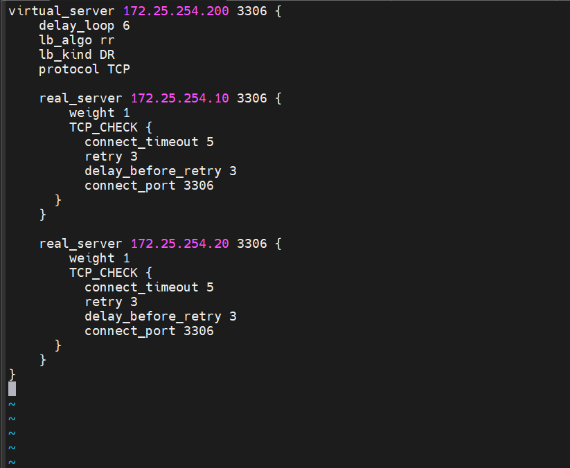 [root@KA1+2 ~]virtual_server 172.25.254.200 3306 {