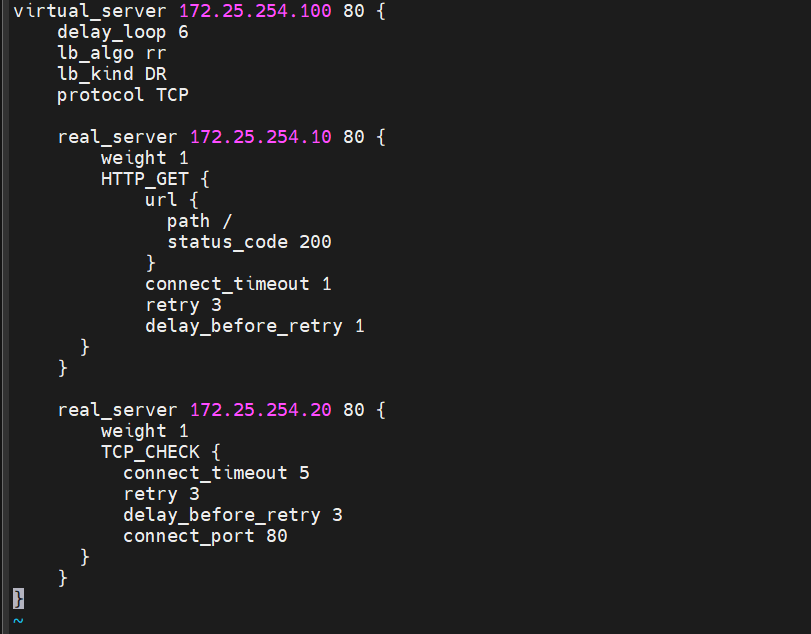 [root@KA1+2 ~]virtual_server 172.25.254.100 80 {