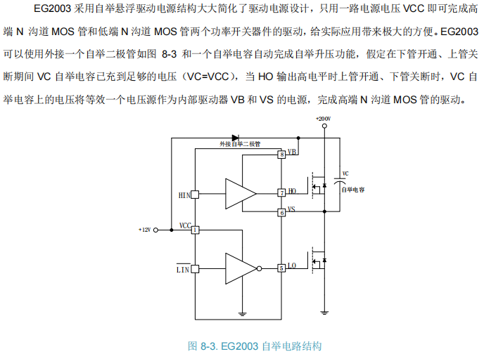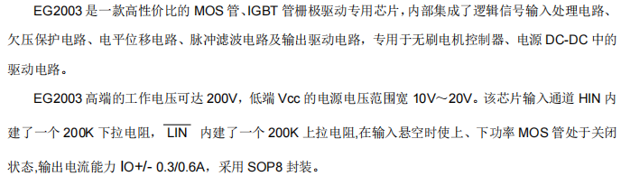 EG2003 以其独特的混合输入逻辑、长达560ns的固定死区以及0.3A/0.6A的适中驱动能力 ,在200V及以下的小功率半桥驱动细分市场中提供了具有差异化的高性价比选择。