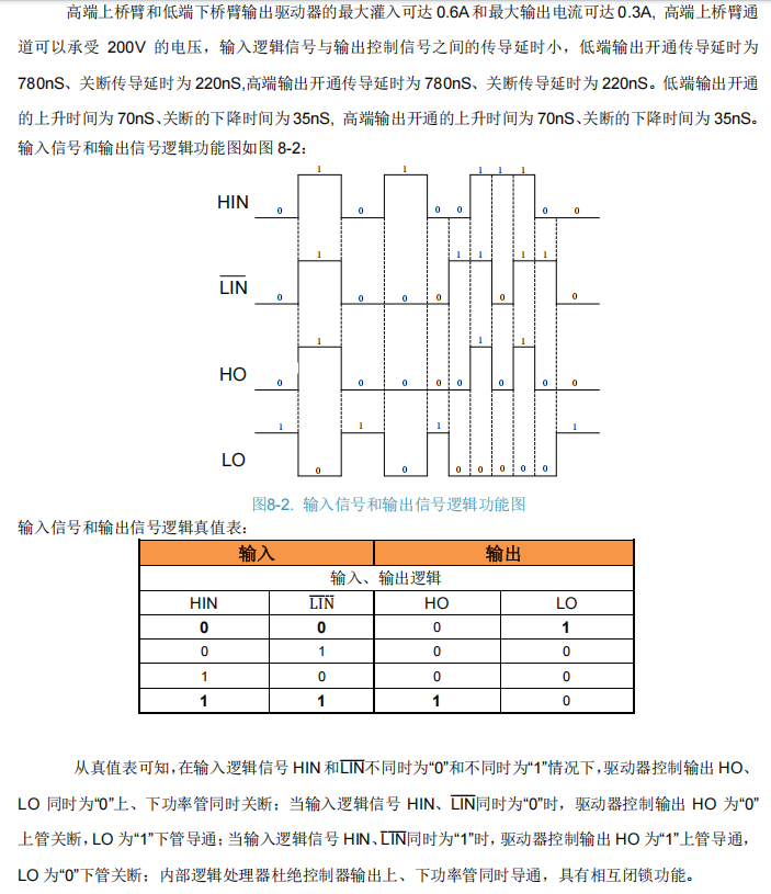 - 紧急停机策略: 将HIN和LIN设置为相同状态(通常为HIN=0,LIN=1,即输入"01"),根据真值表,此时HO=0,LO=0,可实现快速关断。
