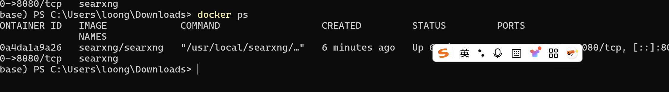 docker run -d --name searxng -p 8080:8080 -v "$env:USERPROFILE\searxng-data:/etc/searxng" --restart unless-stopped searxng/searxng