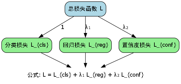 其中, L c l s L_{cls} Lcls是分类损失, L r e g L_{reg} Lreg是回归损失, L c o n f L_{conf} Lconf是置信度损失, λ 1 \lambda_1 λ1和 λ 2 \lambda_2 λ2是权重系数。