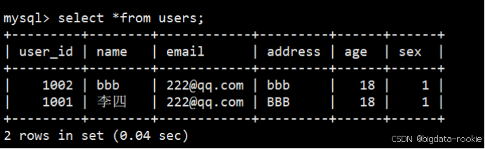 INSERT INTO users VALUES(1002,'bbb','222@qq.com','bbb',18,'1');