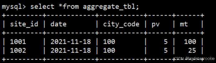 (3)查询测试数据,可以看到pv是sum累计的值,mt是明细中最大的值。如果只需要查看聚合后的指标,那么使用此种模型将会大大减少存储的数据量。