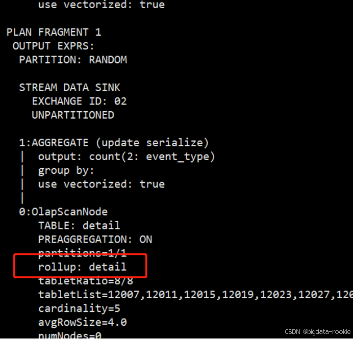 (3)那么如果使用对 event_type 字段使用 count 函数,又可以看到 rollup 命中的是 detail 表;