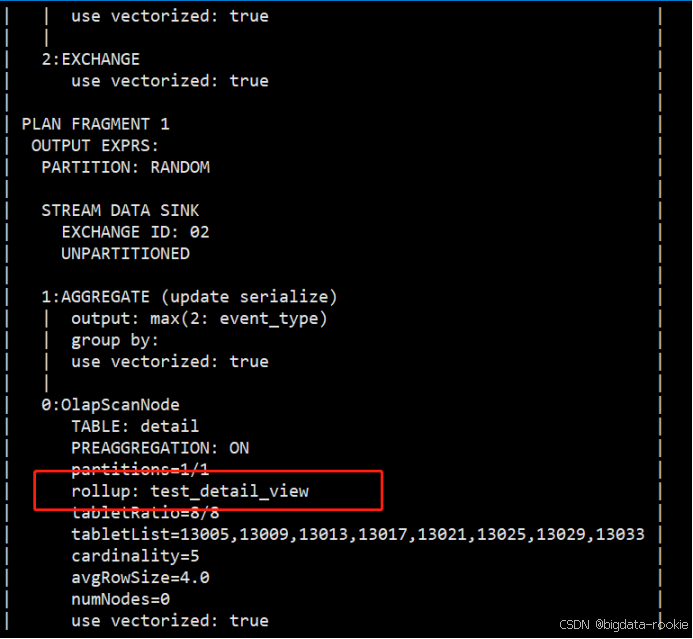 (2)建完视图后,用户并不能感知创建是否成功,可以通过 explain 来分析是否命中视图。可以看到上面物化视图对 event_type 字段使用 max 函数,那么 rollup 命中的数据源为创建的物化视图;