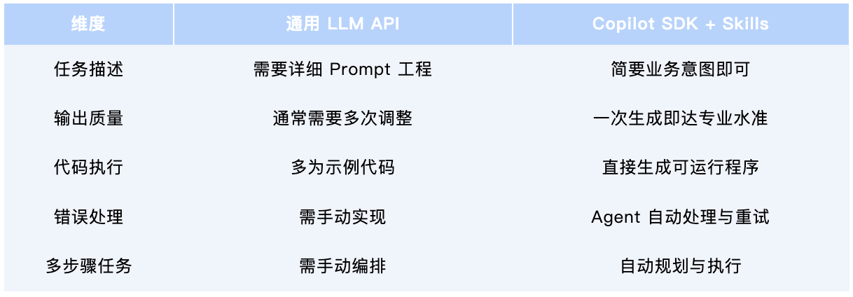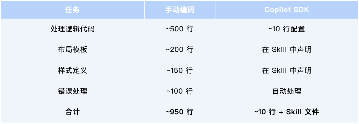 传统 AI 开发需要编写数百行代码来处理 PPT 生成逻辑、布局选择、样式应用和错误处理。借助 Copilot SDK 和 Skills,开发者只需用自然语言描述需求,Agent 即可自动生成并执行所需代码。原本需要 3--5 天的工作,现在只需 3--4 小时,代码维护量减少约 95%。