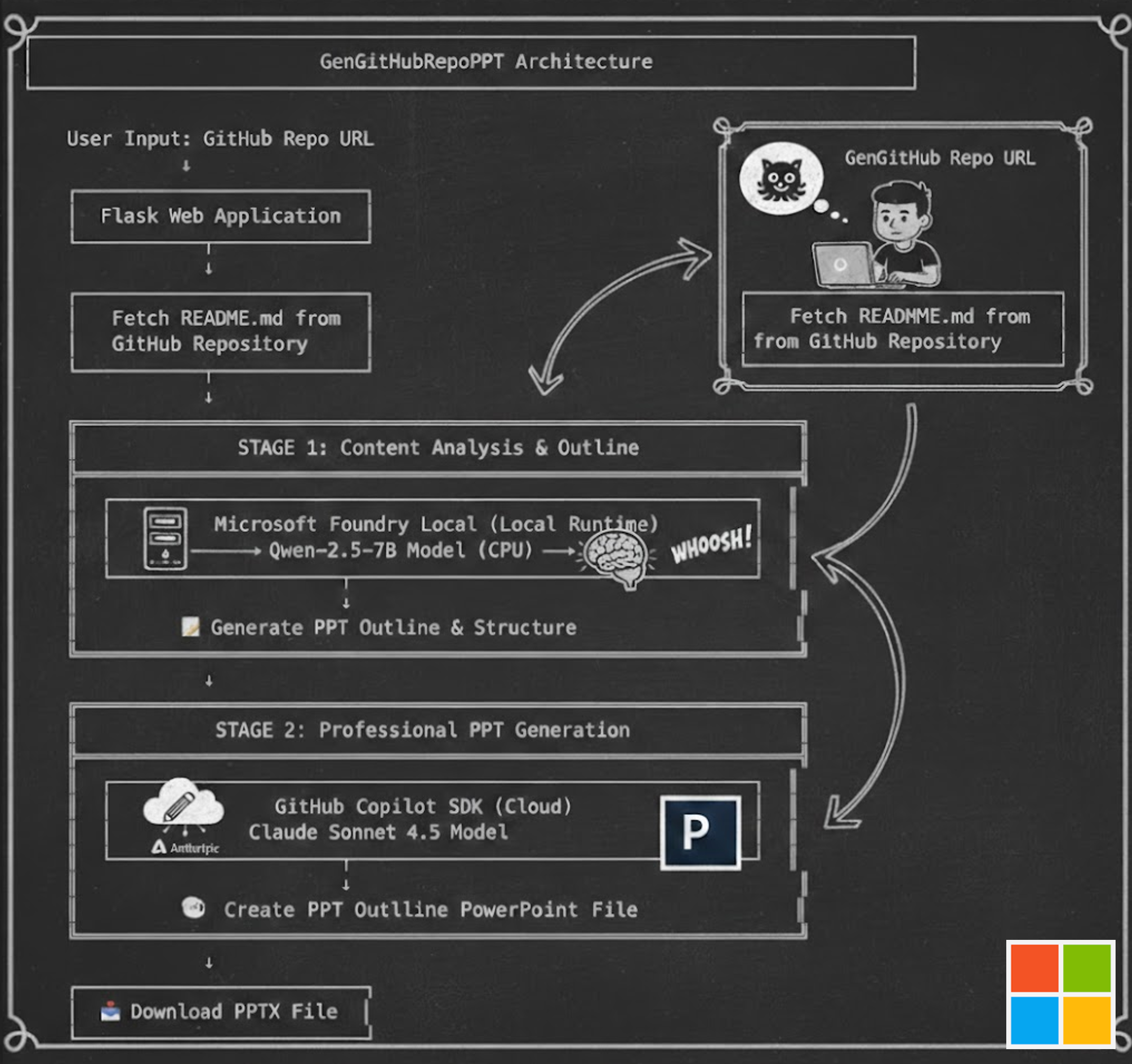 本文将通过 GenGitHubRepoPPT 的视角,探讨混合模型架构,展示如何将 Microsoft Foundry Local、GitHub Copilot SDK 以及其他技术优雅地结合起来,从 GitHub README 文件中自动生成专业的 PowerPoint 演示文稿。