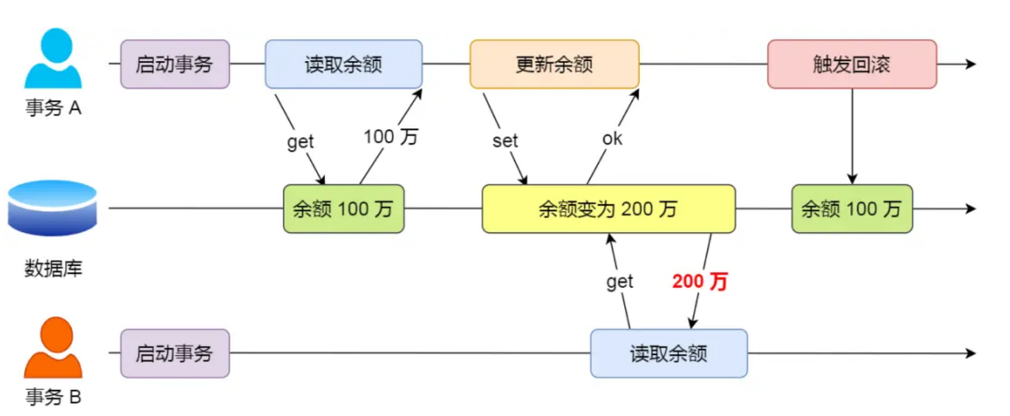 因为事务 A 是还没提交事务的,也就是它随时可能发生回滚操作,如果在上面这种情况事务 A 发生了回滚,那么 事务 B 刚才得到的数据就是过期的数据,这种现象就被称为脏读。