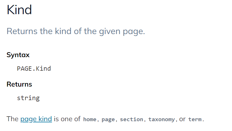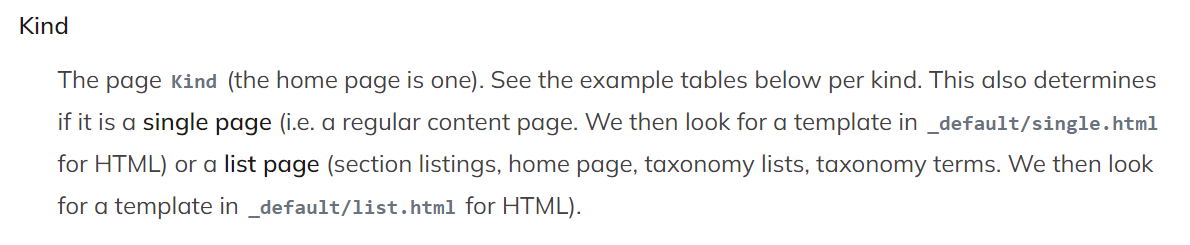 首先,每个页面在 Hugo 里都有一个叫 Kind 的属性,用来表示这个页面的身份 ,关于 Kind 的官方描述如下