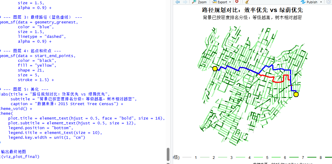 作为地理空间分析,没有什么比一张清晰的对比地图更有说服力了。我们需要验证:那条所谓的"最绿路线",是否真的避开了光秃秃的水泥路,穿过了树木茂密的街区?在这一部分,我们将不再满足于基础的 plot 绘图,而是引入 R 语言中专业的专题地图制作包 tmap。它采用图层叠加的语法逻辑,允许我们将街道背景、树木密度分布、以及两条截然不同的规划路线叠加在一起,制作出一张既美观又具分析价值的地图。我们将以树木密度作为背景底色,直观地展示城市绿肺的分布,并将两条路线高亮显示,从而一目了然地看到算法的决策逻辑。