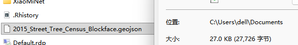 将附件的数据集名字重命名为2015_Street_Tree_Census_Blockface.csv,然后将其粘贴到R的工作目录内。由于目前我们并不知道工作目录在哪,因此需要现在R studio中输入代码进行寻找: