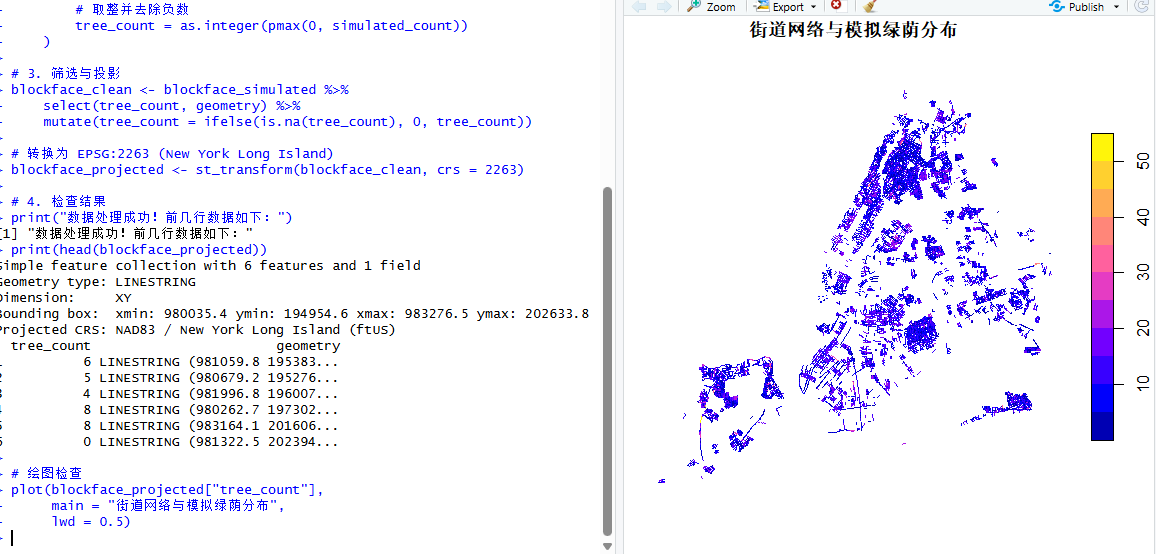 观察结果能够发现,当前加载的数据集不包含树木数量的列,而是包含物理街区几何数据与种植季节规划数据。这份数据提供了街道的形状和长度,但没有包含"这条街上有几棵树"的普查统计结果。我们可以利用 R 语言强大的数据处理能力,基于现有的数据模拟一个树木数量。根据街道的长度来生成树木数量:假设街道越长,树可能越多,并加入一些随机性。复制并粘贴运行以下代码: