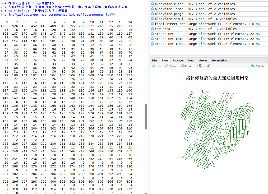 运行这段代码后,可以会发现 street_net 对象中多出了关于节点和边的统计信息。每一条街道都有了它的物理长度(edge_length)和生态属性(tree_count),这张网已经做好了被算法遍历的准备。不过,在正式开始导航之前,我们还需要解决现实数据中常见的一个棘手问题------网络中的断头路和孤岛。