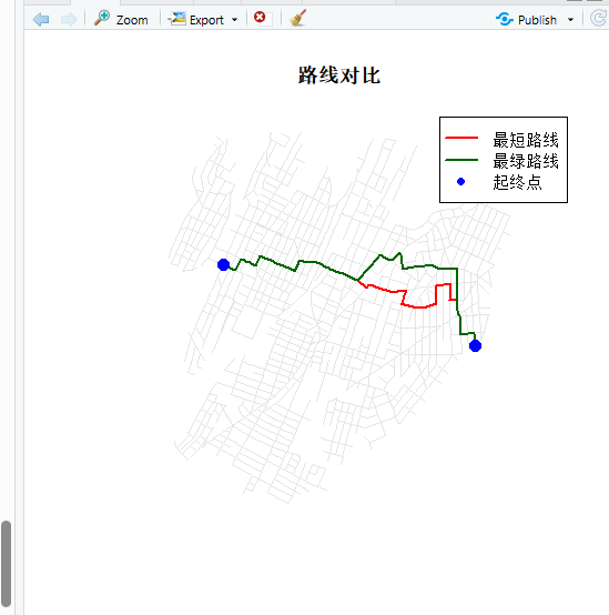 legend("topright", legend = c("最短路线", "最绿路线", "起终点"),