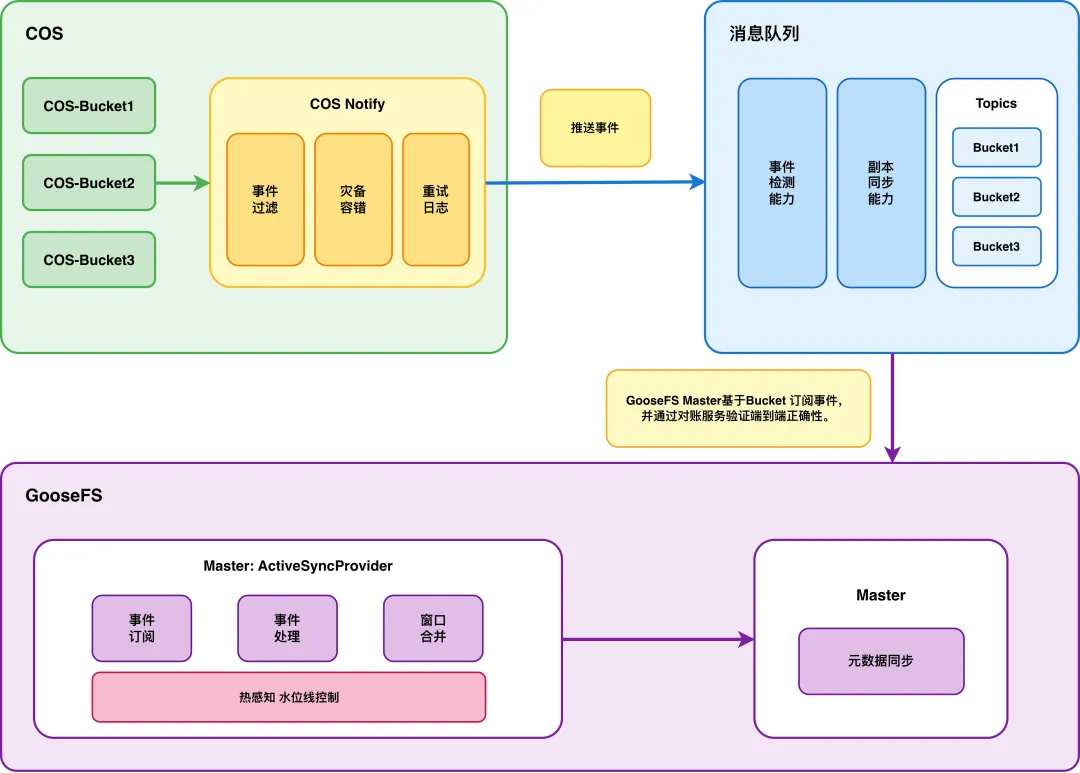 GooseFS 元数据发现功能基于事件驱动架构进行构建,旨在实现缓存层与持久化层之间高效、可靠的元数据同步。其核心链路包含三个关键组件:
