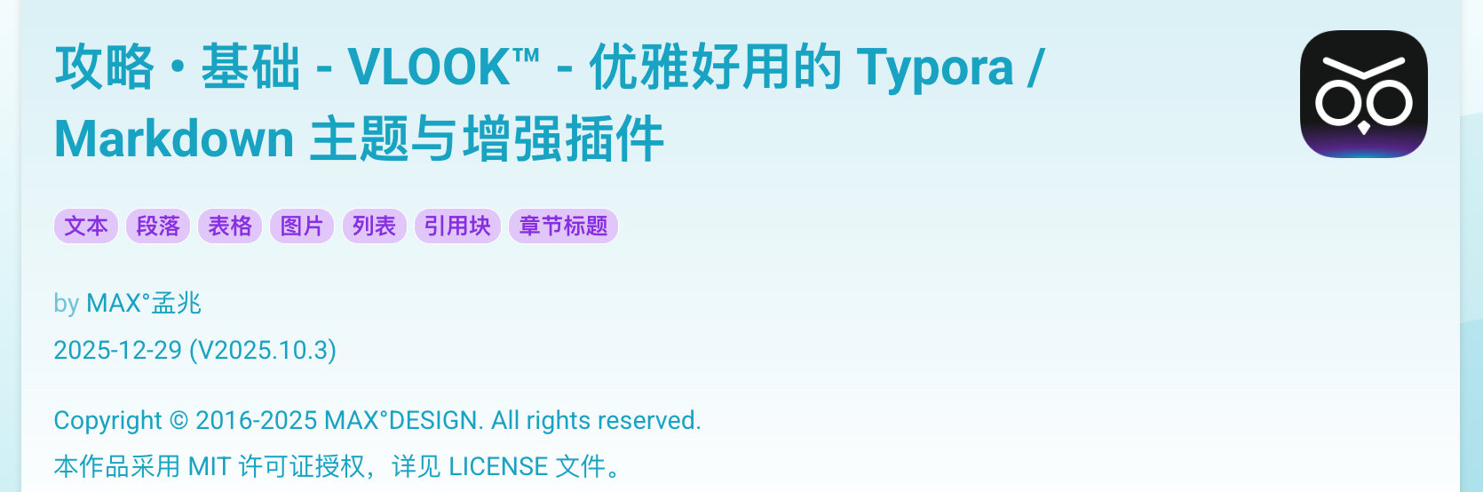 VLOOK™ 是针对 Typora(跨平台 Markdown 编辑器)的主题包 和增强插件 (针对导出的 HTML 文件),旨在与众 Markdown 粉共创 Markdown 的自动化排版 2.0,在保持 Markdown 简洁性的基础上,让编辑、阅读 Markdown 文档更实用,也更愉悦。