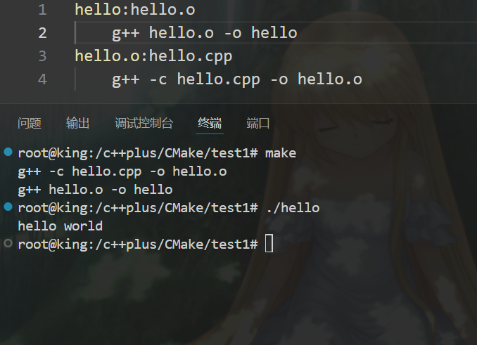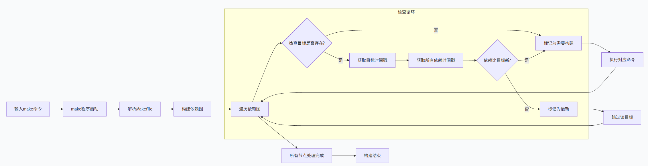 3> 什么都没修改后构建:什么都不做那么其实,看到这我相信聪明的你一定能想明白了,也就是我们的依赖关系在此处是大有作为的,有了它,我们就不用傻傻的因为一个文件的改动,而动了所有的文件,我们只会根据我们的依赖项,去针对性的处理我们的中间操作,当然此处的文件时间戳检查实际是由我们的make指令来实现的,没事,我们马上就讲。