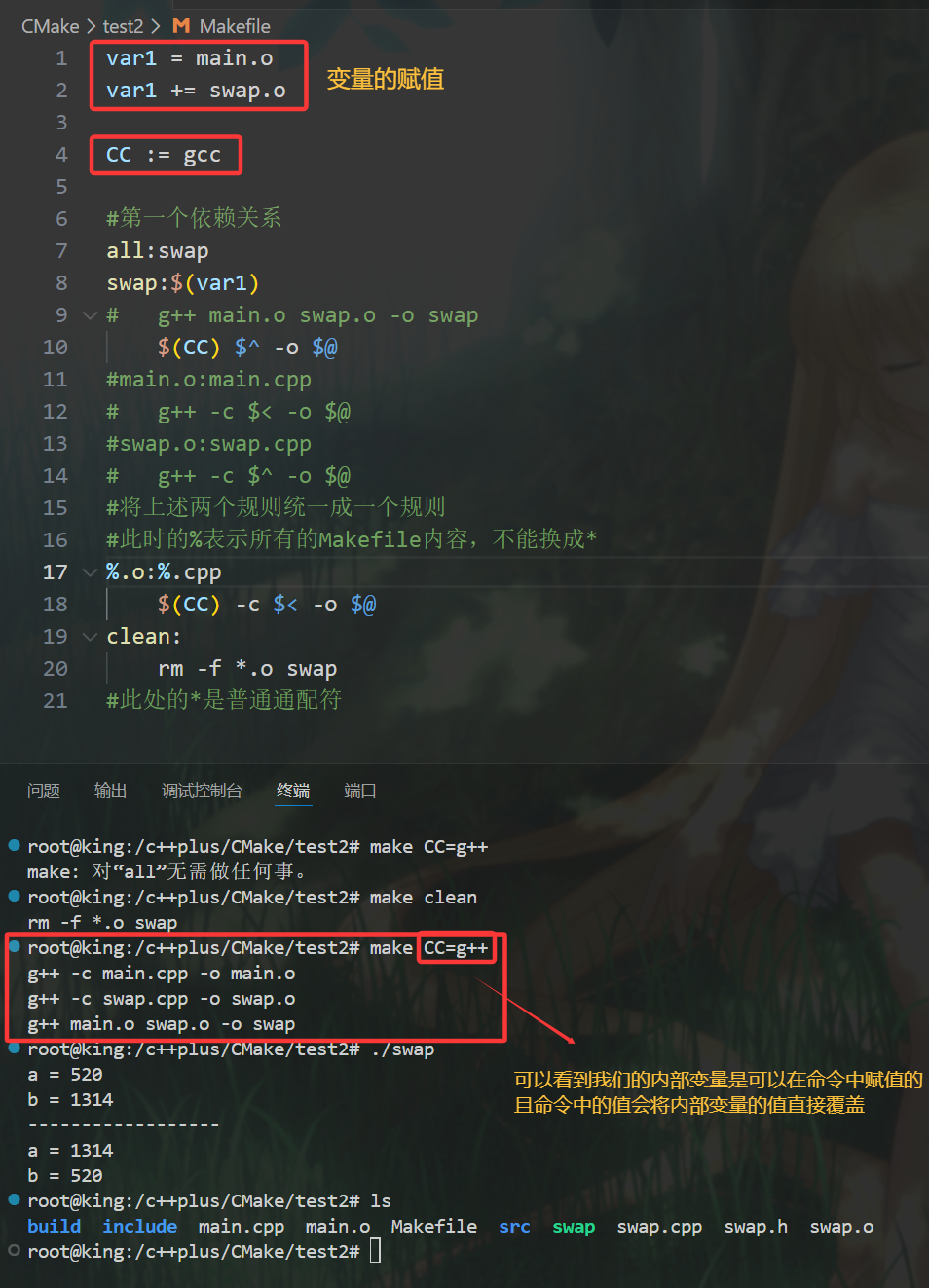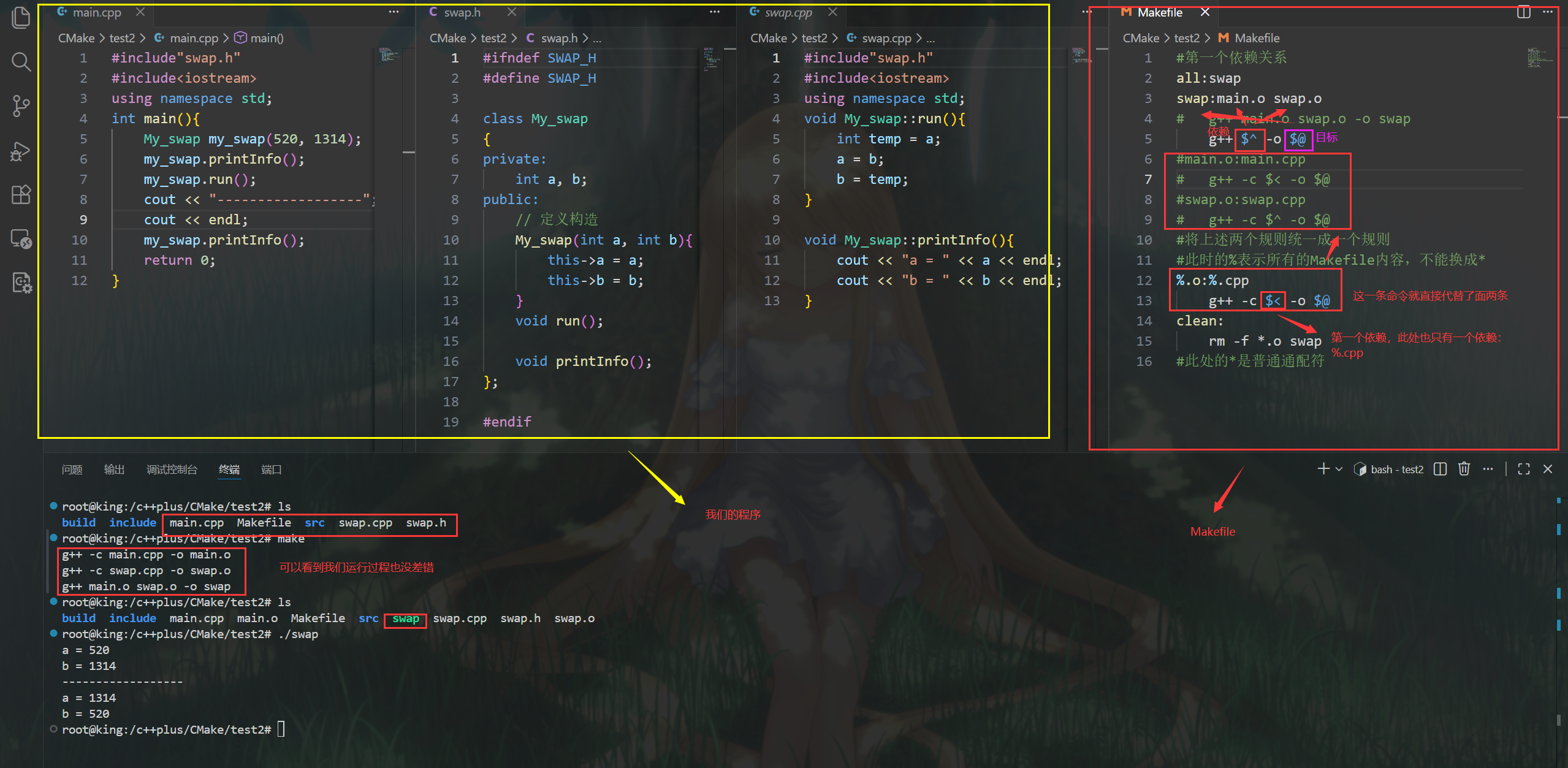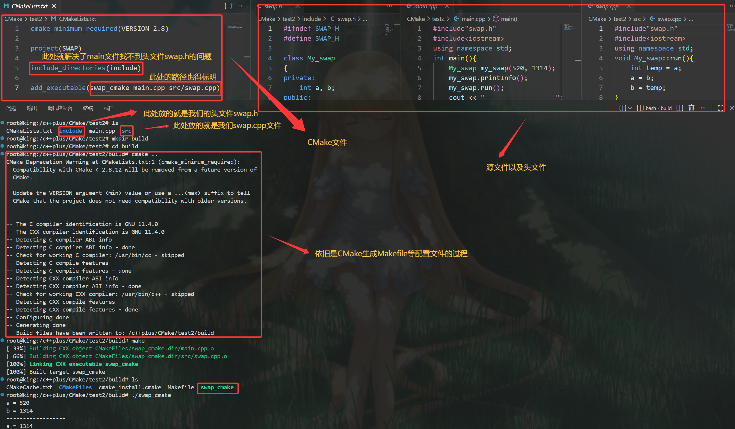 依旧直接上图,此处用的代码与我们刚makefile演示的swap一样。但值得一提的是 ,多文件编译更依赖于我们的CMake/Makefile,因为在vscode多文件编译时,我们的头文件是无法直接被读取的,必须要在同一目录下才能读取到,但这样就与我们多文件编译冲突了。