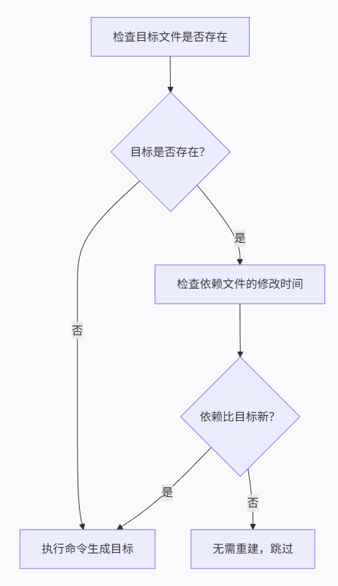 我们想执行一个.cpp文件的时候,是不是得经过四个步骤:预处理 --> 编译 --> 汇编 --> 链接****然后最后才能生成我们的可执行程序,那么我们把这四个步骤拆分成文件来看是不是对应着 .cpp -> .i -> .s -> .o这四种文件。那么我们就可以顺势理解为:可执行程序 ---依赖于---> .o文件 ---依赖于---> .s文件 ---依赖于---> .i文件 ---依赖于---> .cpp文件 这一串关系链,那么这就是我们所谓的依赖关系检查,可能看到这,其实我相信大部分人都会觉得这不是一种很常识的常识吗,但其实看我们第二个特性就知道我在强调什么了。