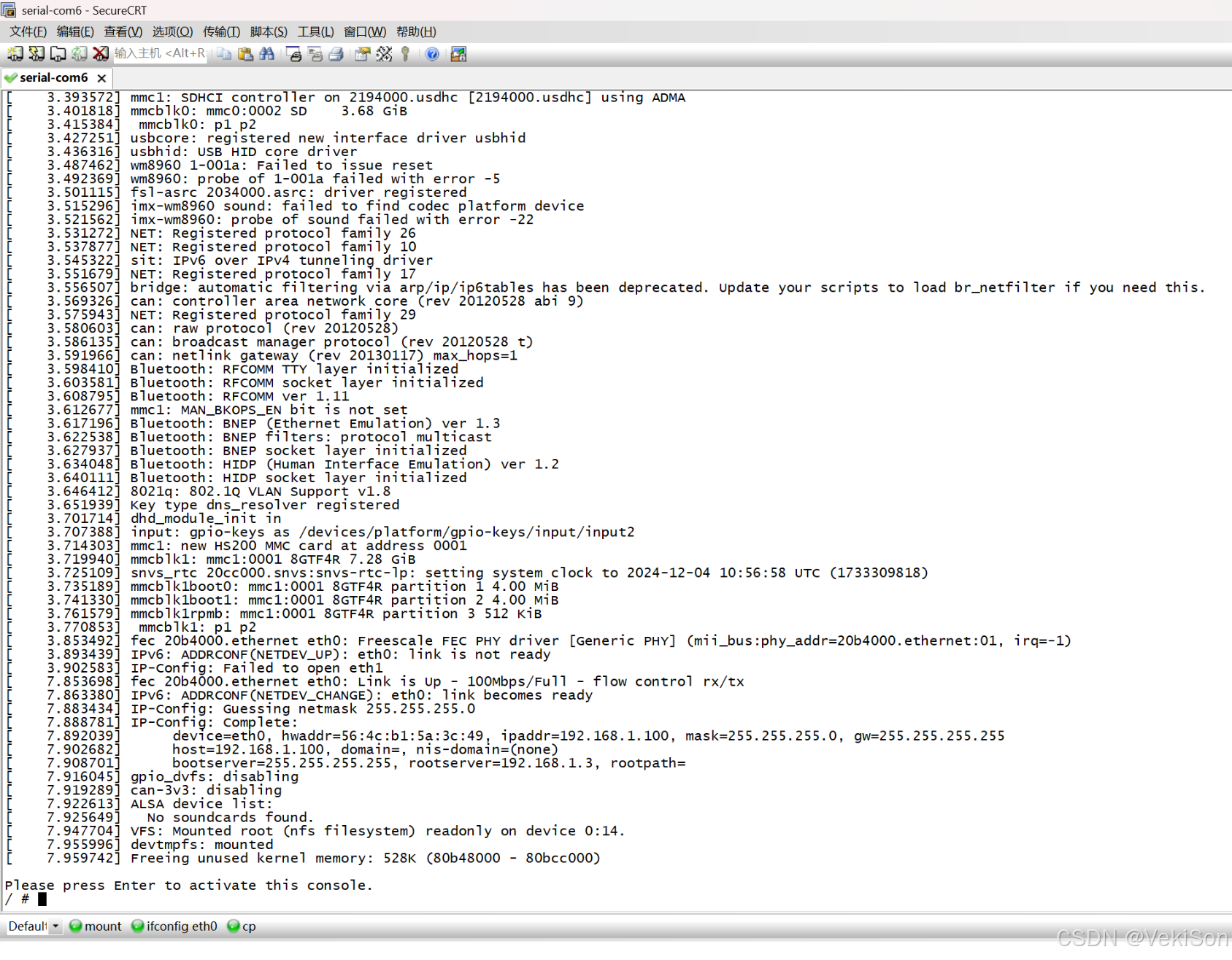 - Bootloader 向内核传递 bootargs 启动参数(指定 NFS 根文件系统路径、IP 地址等),执行bootz 命令启动内核;