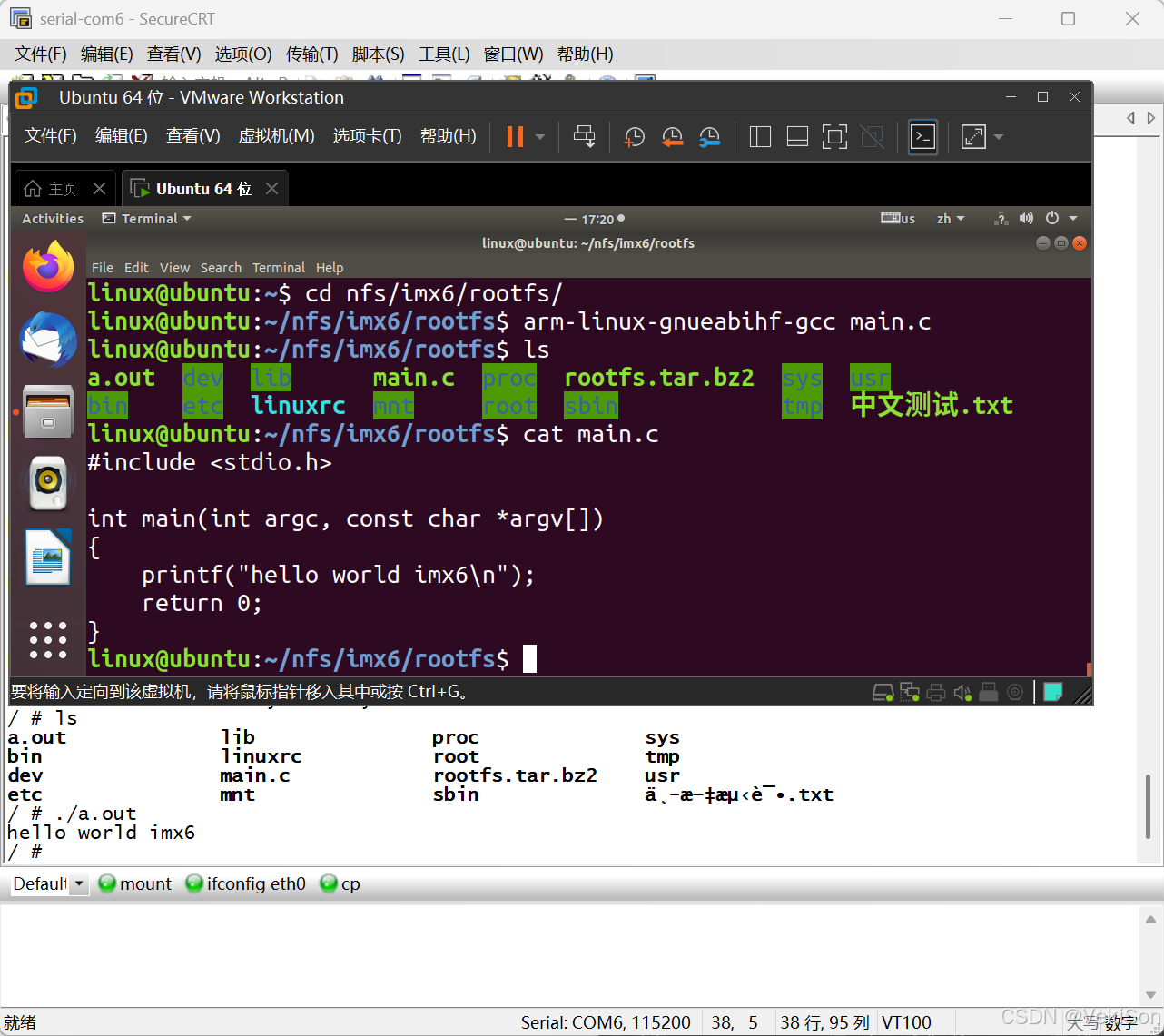 例如,在 Ubuntu 中新建 main.c 文件并编译后,可在 ARM 开发板上运行 a.out 程序: