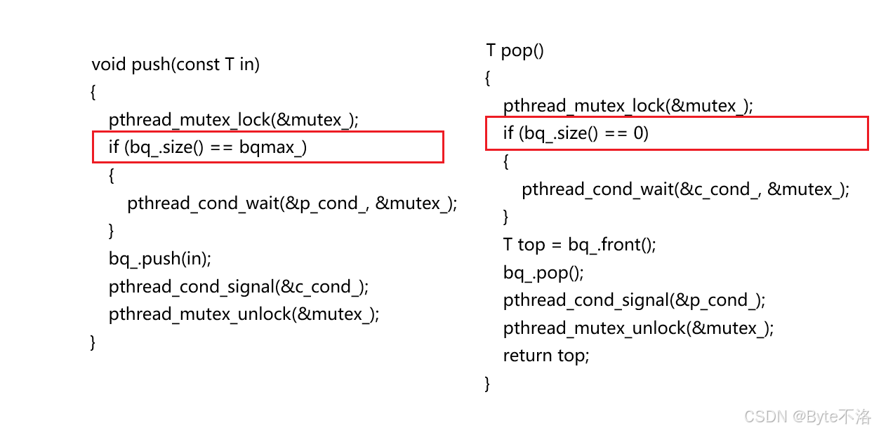 所以为了避免伪唤醒的情况发生,这个时候我们只需要进行循环判断条件是否满足即可,因为这样即使是生产者申请到锁了,但是再次判断的时候,资源依旧不满足,这个时候条件变量就会将其挂起,最后将它的锁进行释放,这样就可以避免伪唤醒的情况。