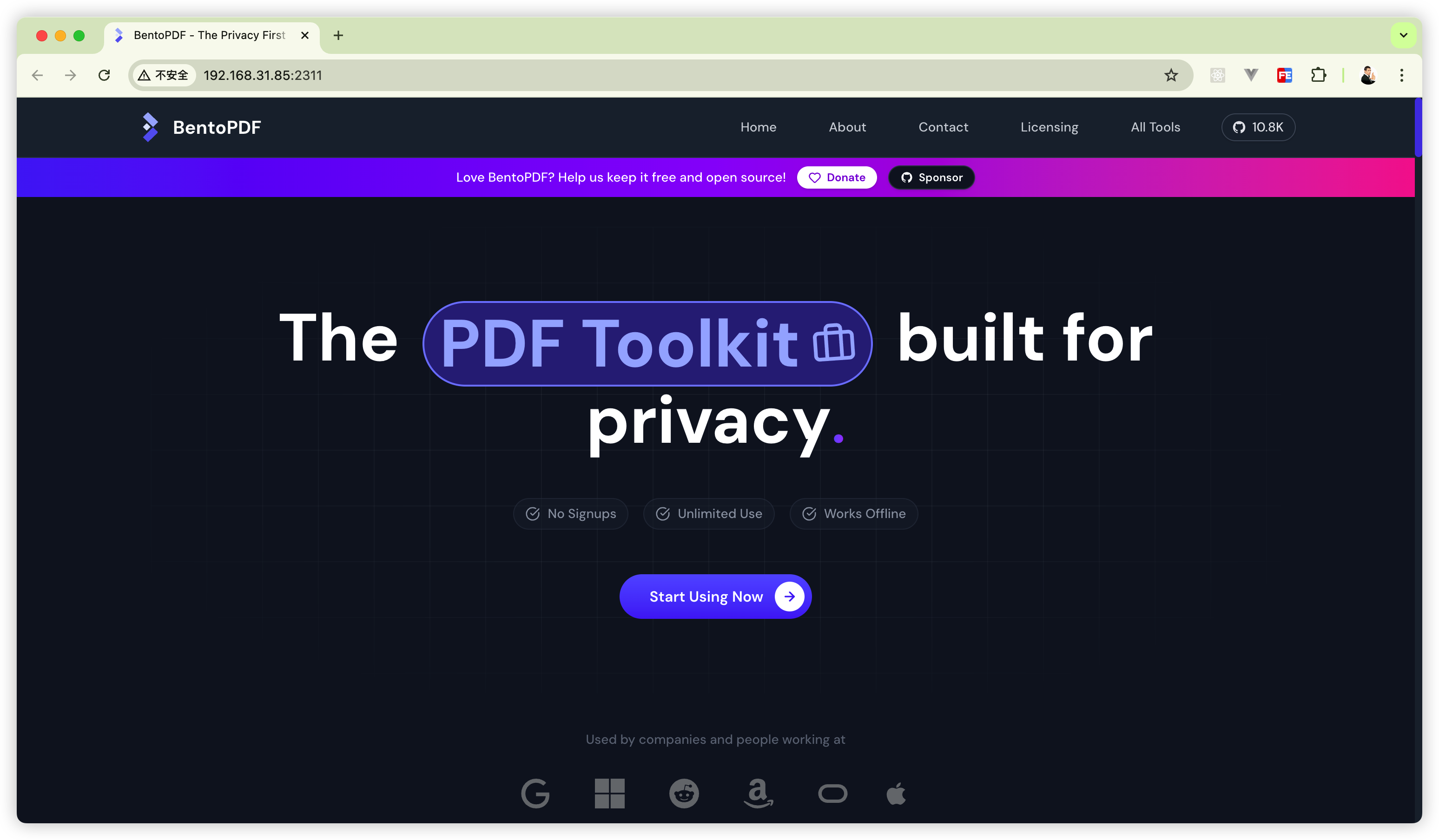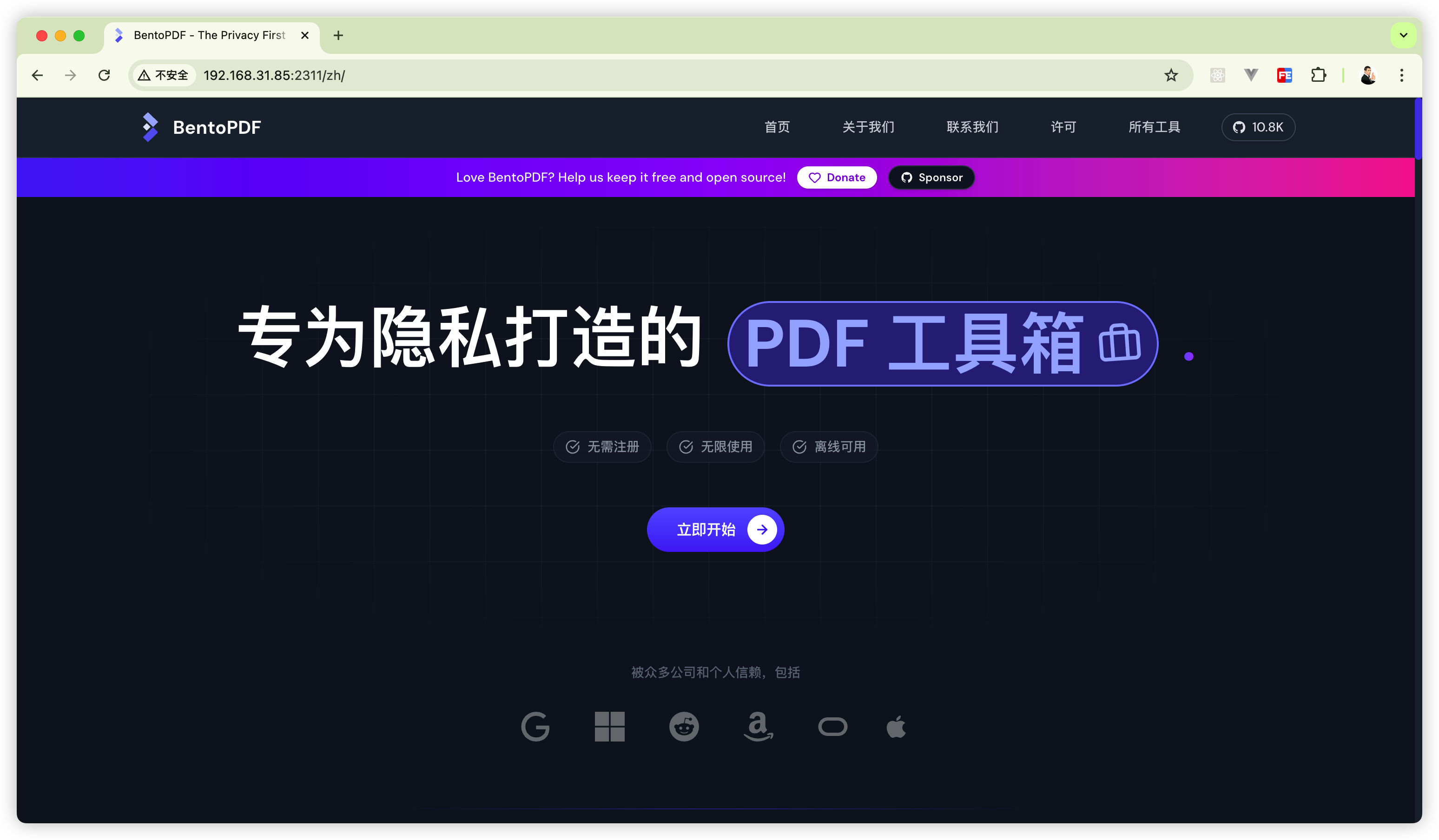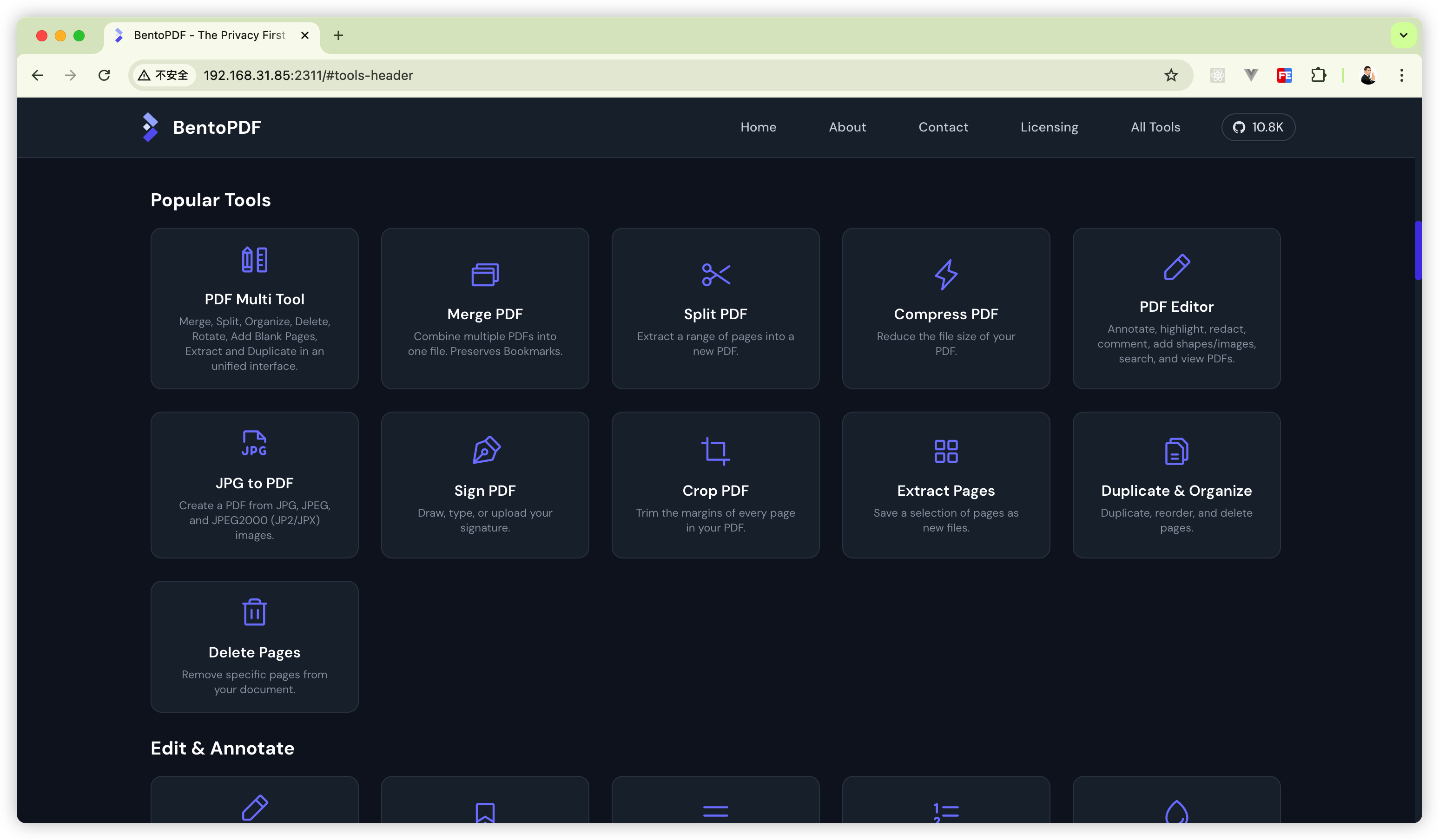 完成上面的操作后,打开浏览器,输入你 NAS的IP + BentoPDF端口,就能使用 BentoPDF 了。
