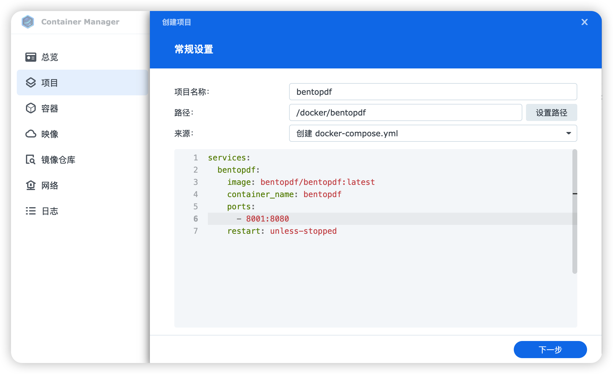 然后点击"下一步",开始拉取「BentoPDF」镜像。