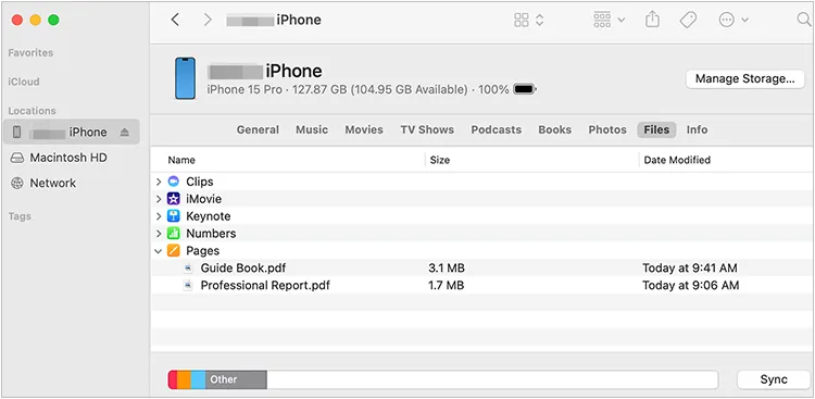 对于 Mac 用户,Finder 提供了一种内置的音频文件传输方法。只需通过 USB 连接 iPhone,打开 Finder,然后选择您的设备即可。然后,您可以将大型音频文件从 iPhone 拖放到 Mac 上。操作简单、快捷,无需任何额外软件。