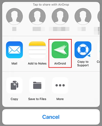 在 iPhone 上找到音频文件并将其分享到 AirDroid 应用。在 AirDroid 应用内,选择要发送文件的 Android 设备。传输将通过 Wi-Fi 开始。