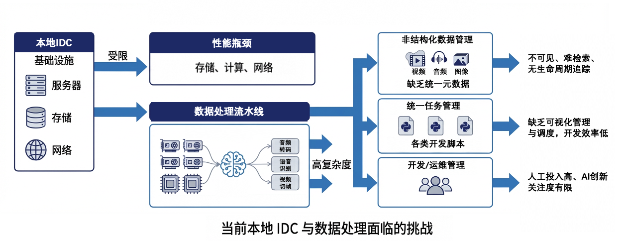 随着模思业务规模的扩大和模型训练对数据量、处理时效性的要求提升,原有IDC基础设施在计算弹性、存储容量、I/O性能、网络带宽等方面已无法满足高并发、大规模音视频等多模态数据的处理需求。
