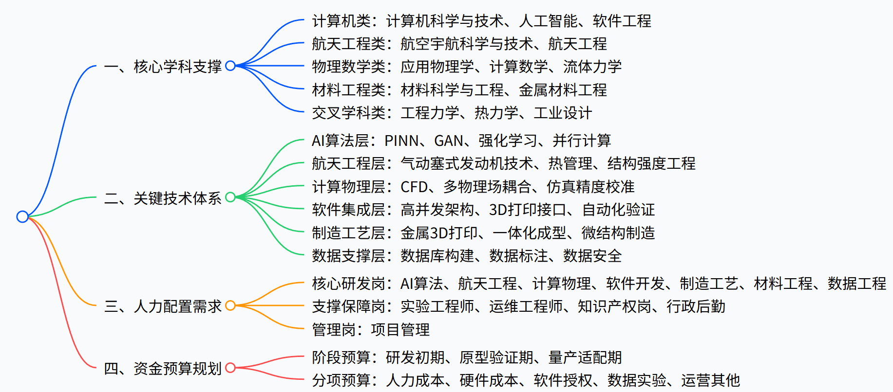 LEAP71 的 Noyron AI 模型之所以能攻克困扰航天界 60 年的 "气动塞式发动机" 设计难题,关键在于其没有脱离工程实际空谈技术,而是将每一项核心技术都与火箭发动机的高温、高压、高可靠性需求深度绑定。本文将以 "AI 算法赋能物理世界造物" 为核心逻辑,用通俗易懂的语言和结构化表格,详细拆解开发此类软件所需的 7 大类科学工程前置技术,同时附上人力配置、资金预算与实施路径,为技术创业者、航天从业者、科研团队提供一份可落地的全景指南。