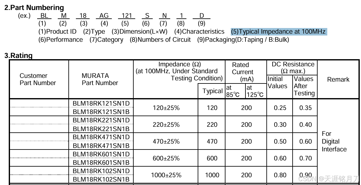 **磁珠:**主要参数是阻抗 (Z),单位是欧姆(Ω)。其规格通常标示为在特定频率下的阻抗值,例如"600Ω @ 100MHz",表示在100MHz频率下其阻抗为600欧姆。