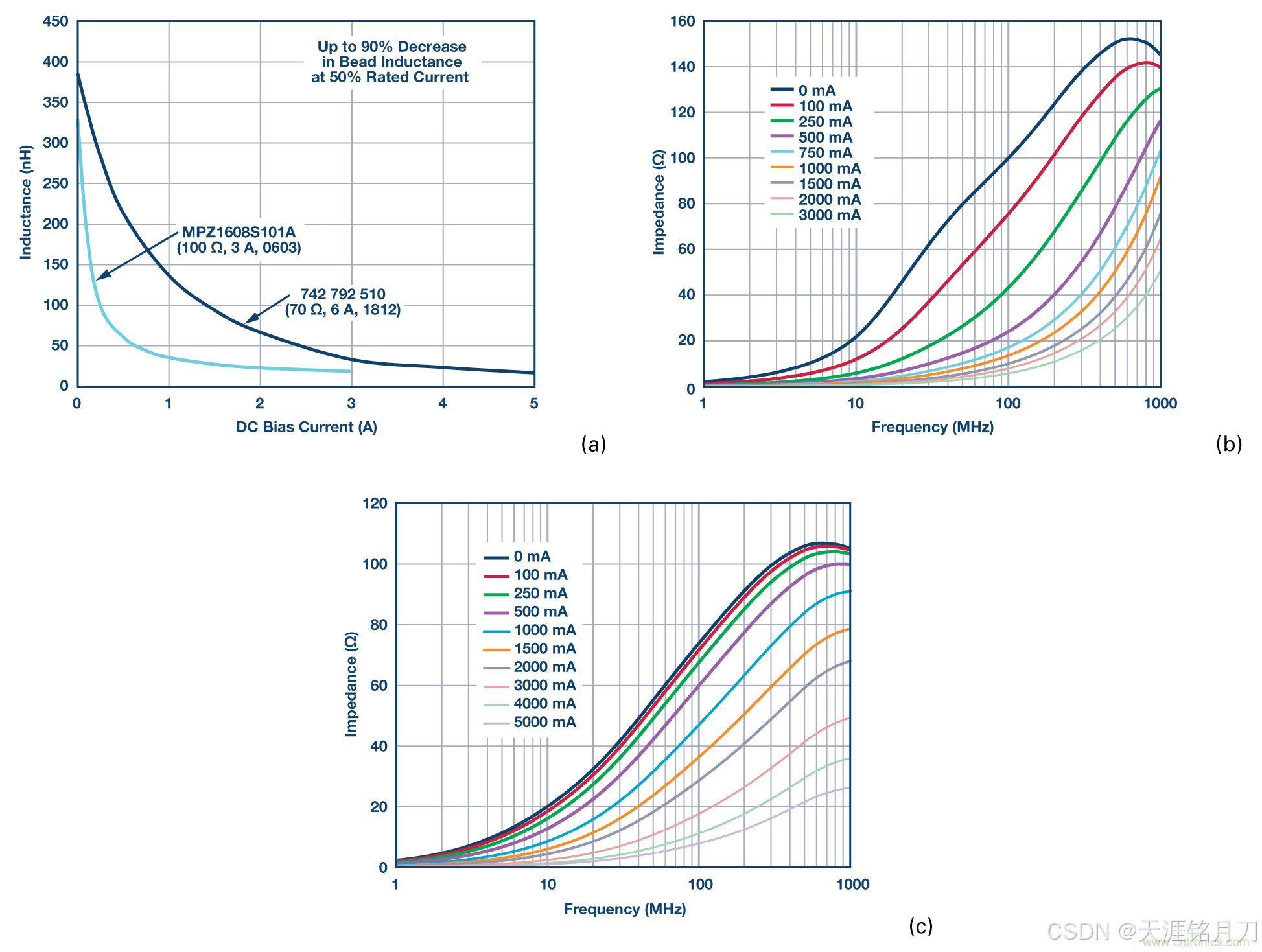 磁珠的性能由 "阻抗-频率"曲线 定义。直流电流的影响直观地体现在这条曲线上: