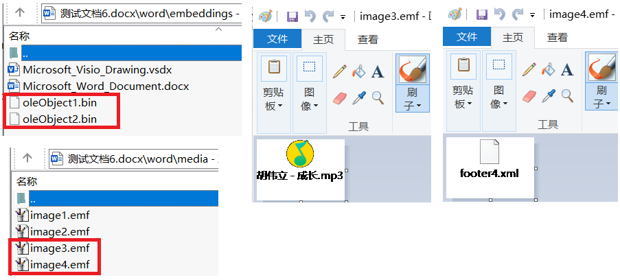 OpenXml中使用EmbeddedObjectPart类处理Word文档内嵌入的OLE对象,MainDocumentPart类的EmbeddedObjectParts属性保存所有的OLE对象。以下图为例,向上一篇文章中的word文档中粘贴mp3文件和xml文件,采用解压缩软件打开Word文档,其内的embeddings文件夹中圈红处保存后续插入的两个文件的OLE对象数据,而media文件夹内圈红处则保存每个OLE对象在word文档中的显示图标。