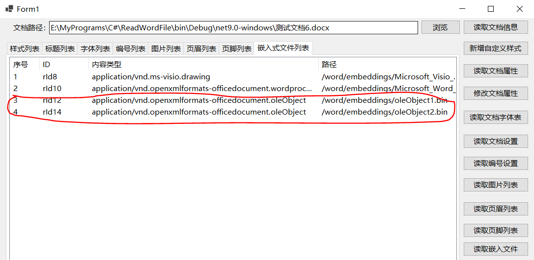 EmbeddedObjectPart类的RelationshipType属性为固定字符串,值为"http://schemas.openxmlformats.org/officeDocument/2006/relationships/oleObject",ContentType属性保存内容类型,通过Uri属性可以获取ole对象文件的路径及文件名,不过对于OLE对象而言,ContentType的值大部分都是相同的,不像EmbeddedPackagePart类的ContentType值区别较大。下面的代码及截图用于获取word文档的ole对象列表(追加到前一篇文章的嵌入文件列表内)。