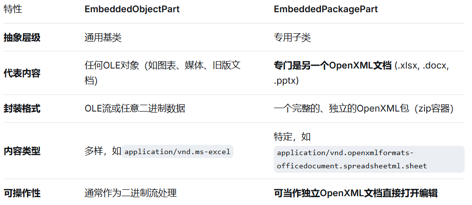 EmbeddedPackagePart类和EmbeddedObjectPart类的功能和定位都类似,前者专用于嵌入另一个OpenXML格式的文档,是一个完整的、压缩的OpenXML包,内部结构与主文档相同,而后者则是一个通用容器,嵌入的可以是早期二进制格式(如 .xls)、图表、媒体文件等,数据组织方式各异。通过大模型给出这两者的区别以供参考:
