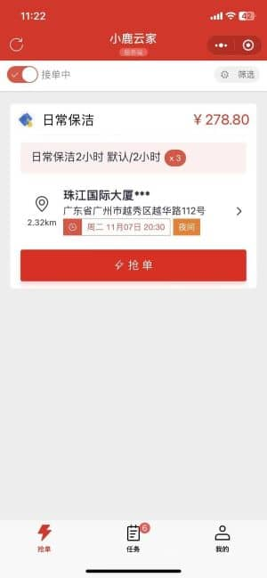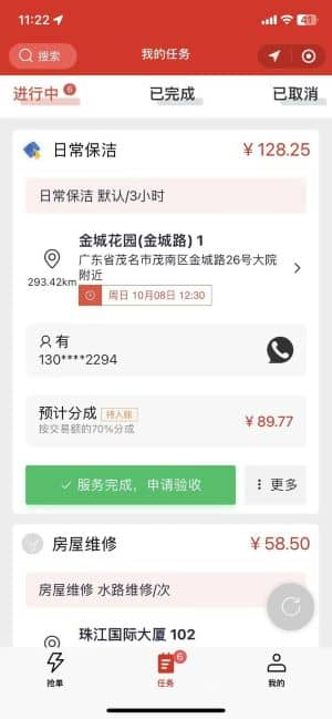 - 抢单与任务管理服务者可在 "抢单" 页面接收平台推送的订单,例如 "日常保洁 2 小时",订单卡片清晰显示服务价格、地址、时间等信息,点击即可接单。在 "我的任务" 页面可查看 "进行中""已完成""已取消" 的订单,完成服务后点击 "服务完成,申请验收" 即可发起结算。