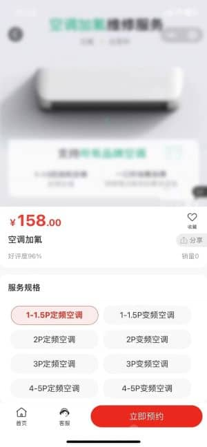 - 服务详情与预约以空调加氟服务为例,详情页展示 158 元的统一价格、好评率和销量,服务规格细分为 1-1.5P 定频 / 变频空调、2P 定频 / 变频空调等多种选项,用户可按需选择并点击 "立即预约"。