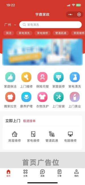 - 首页与服务入口顶部定位默认显示当前城市(如广州),支持手动切换。搜索栏可输入关键词快速查找服务,下方以图标形式展示家庭保洁、家电清洗、上门维修等十余类服务,还有 "立即上门" 板块提供房屋维修、家电维修等紧急服务入口。