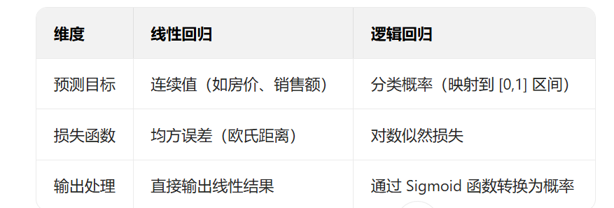 逻辑回归的核心是通过 Sigmoid 函数,将线性回归的连续输出映射到 [0,1] 区间,从而表示 "属于正类" 的概率。