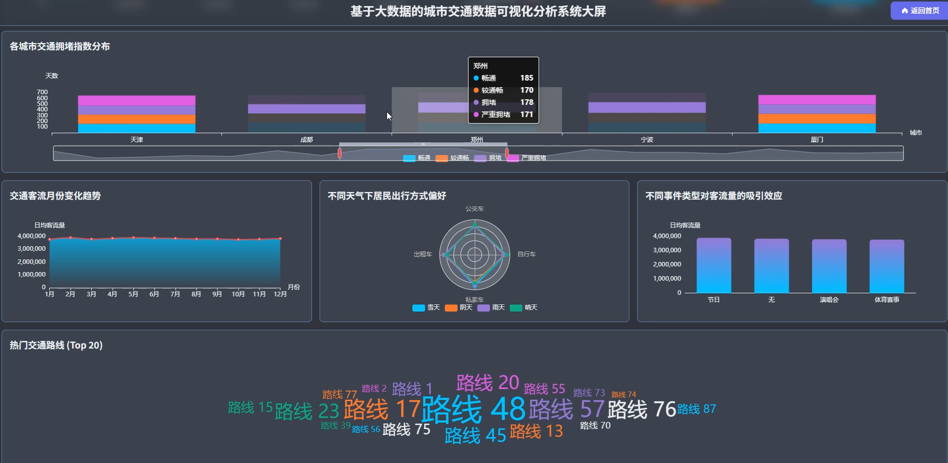 这套《基于大数据的城市交通数据可视化分析系统》主要是想帮大家解决毕业设计选题难、技术栈不会选的问题,整个系统完全围绕Hadoop生态和Spark计算框架来搭建,用的是PySpark做数据分析,数据来源于一个包含城市、日期、客流量、天气、交通状况指数等10个字段的CSV数据集。系统能做的东西还挺实在的,比如分析不同城市哪条路线最繁忙、下雨天是不是更容易堵车、节假日对交通影响有多大这些具体问题。技术上会涉及到数据清洗转换、聚合统计、K-Means聚类这些操作,最后输出成CSV文件方便做可视化展示。整套流程走下来,既能体现大数据处理的核心能力,又不会搞得太复杂让你答辩时讲不清楚,挺适合想稳妥过毕设又希望有点技术含量的同学。
