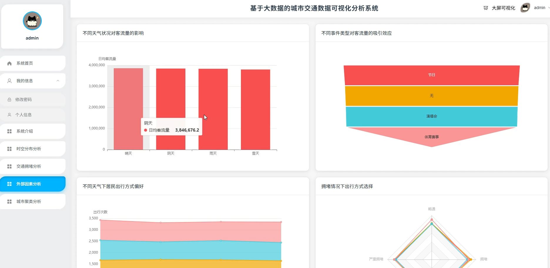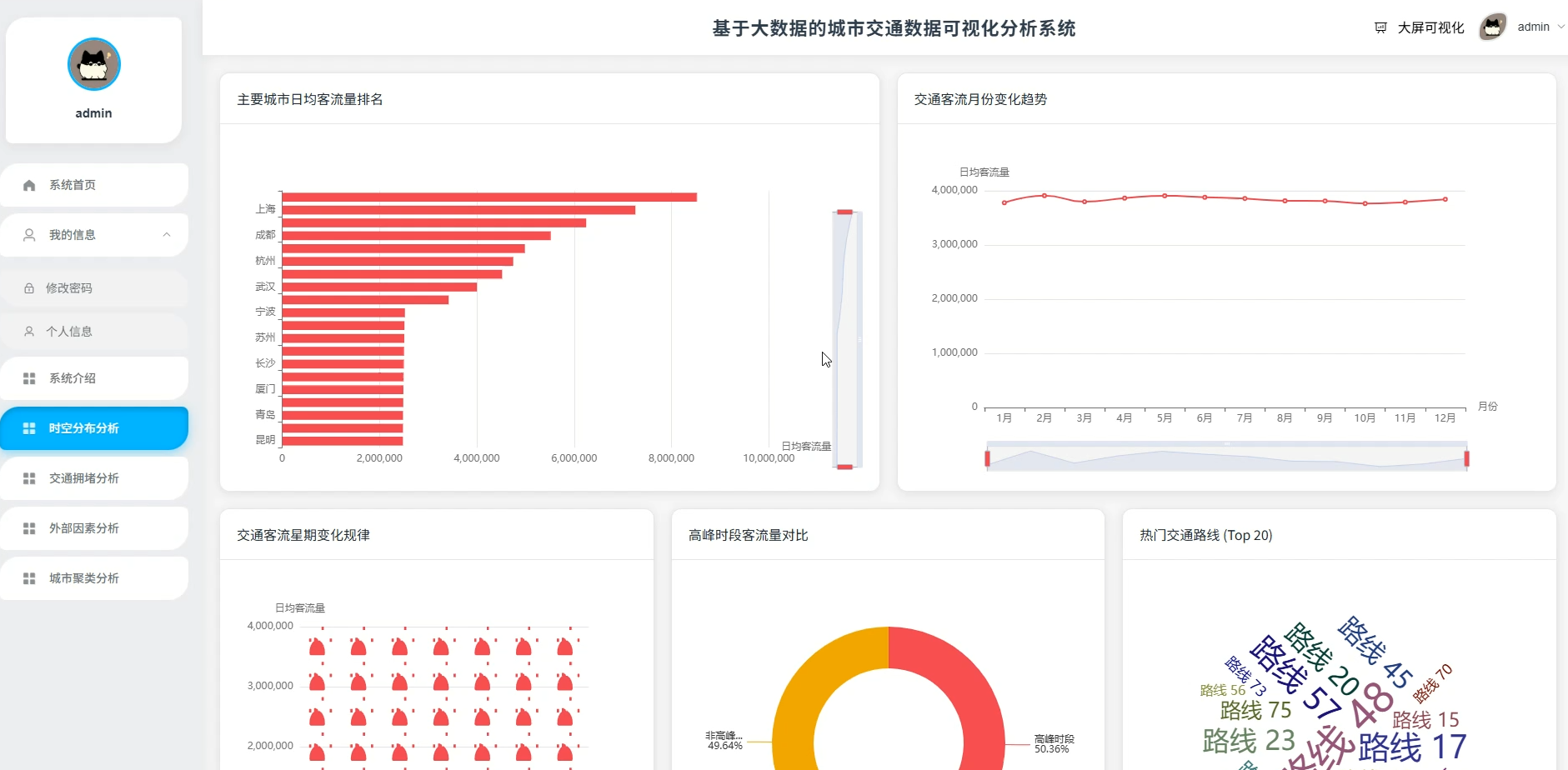 选题意义:做这个系统的意义吧,说大不大说小不小,主要是几个方面。对学生自己来说,这是个挺好的练手机会,能真正把Hadoop和Spark这些课堂上听过的技术用起来,走完数据清洗、分析、建模的全流程,比光看书强多了。对实际应用层面而言,这套分析方法能给城市交通管理提供点参考思路,比如通过数据看出哪条路线常年拥堵、什么天气下需要提前调度车辆,虽然只是个毕业设计做不到实时监控那么高级,但至少能展示数据分析在交通领域的价值。另外这种基于聚类的城市分类方法,也能为同类城市的交通规划提供横向对比的视角,算是用技术思维看待城市问题的一种尝试吧,当然啦,系统还有不少粗糙的地方,主要是抛砖引玉。