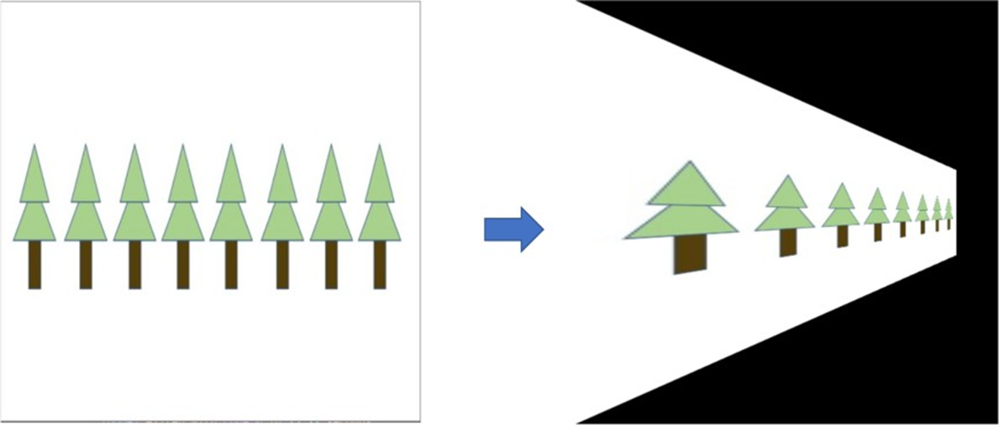 图像的透视来原于绘画理论,指在平面或曲面上描绘物体的空间关系的方法或技术。例如我们通常所说的"近大远小"就是透视技术的一种,如图所示。具体实现方式就是通过透视变换将某一矩形映射为任意四边形。