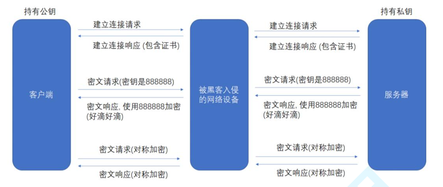 双方开始采用X进行对称加密,进行通信。但是一切都在中间人的掌握中,劫持
