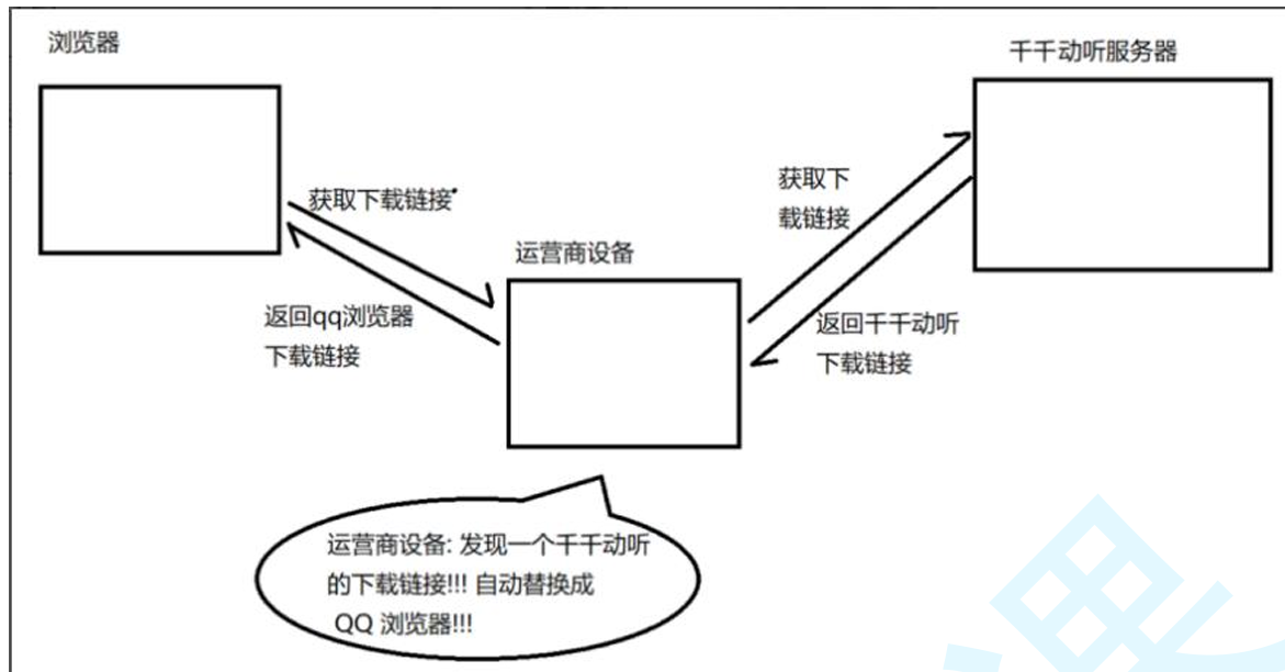 由于我们通过网络传输的任何的数据包都会经过运营商的网络设备(路由器,交换机等), 那么运营商的网络设备就可以解析出你传输的数据内容,并进行篡改. 点击"下载按钮",其实就是在给服务器发送了一个HTTP请求,获取到的HTTP响应其 实就包含了该APP的下载链接.运营商劫持之后,就发现这个请求是要下载天天动听, 那么就自动的把交给用户的响应给篡改成"QQ浏览器"的下载地址了.