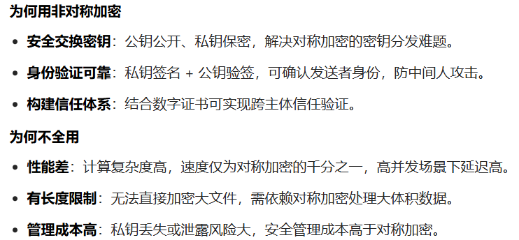 - 非对称加密算法通常对单次加密的数据长度有限制,无法直接处理大体积数据,必须拆分多次加密,进一步降低了效率。