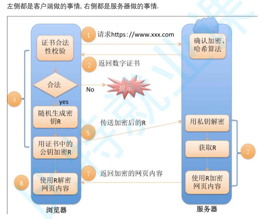 第⼆组(非对称加密):用于协商生成对称加密的密钥.客户端用收到的CA证书中的公钥 (是可被信任的)给随机生成的对称加密的密钥加密,传输给服务器,服务器通过私钥解 密获取到对称加密密钥.